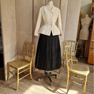 Few other garments in fashion history are as iconic as Dior’s ensemble “Bar” from his inaugural 1947 collection, commonly known as “New Look” . It consists of a cream silk jacket with soft shoulders, nipped in waist and padded hips and a pleated black wool skirt with an enormous hem circumference. It was a clear cut from the austere and mannish tailored ladies’ fashions of the previous decade.